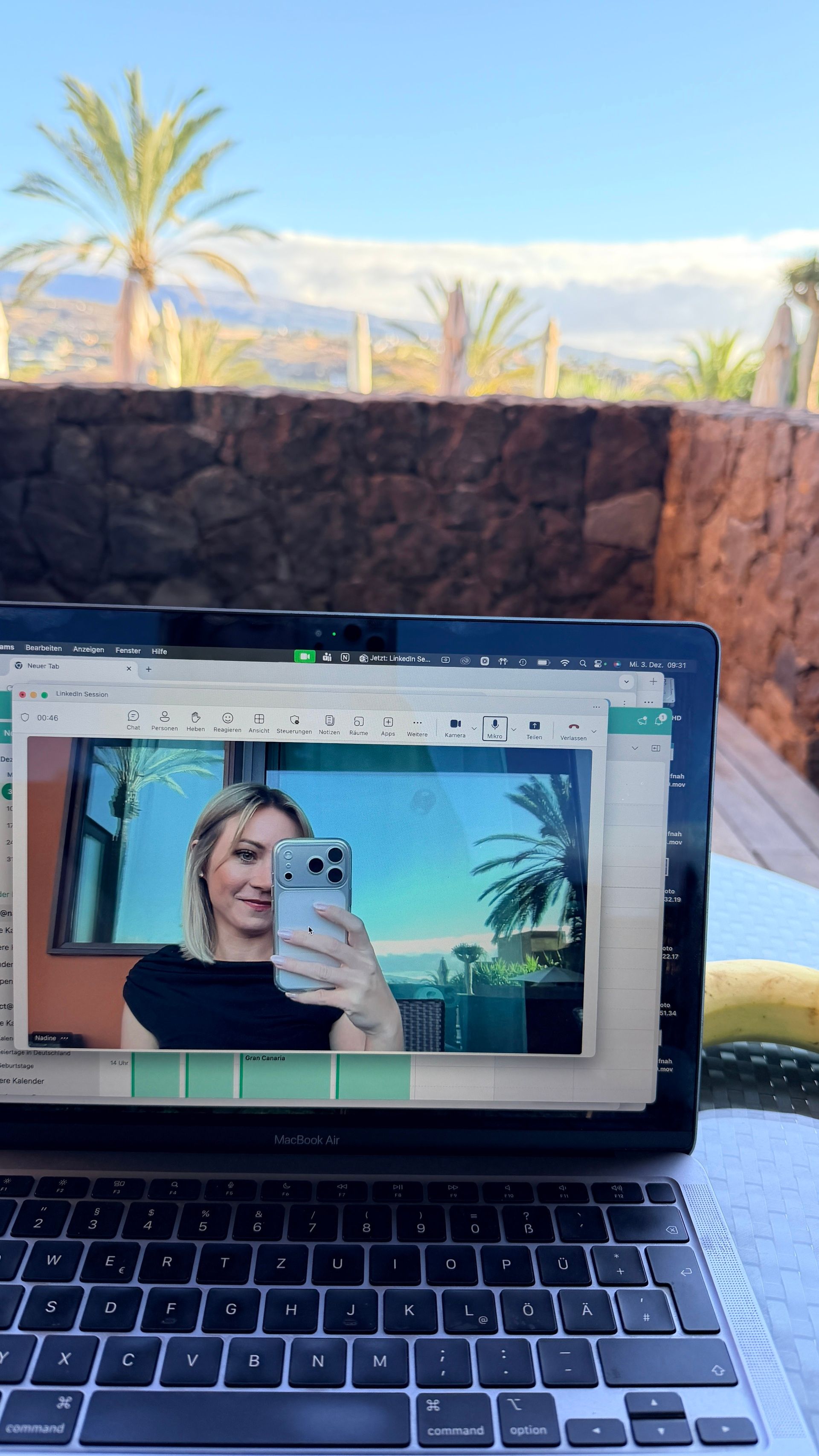 Ich sitze gerade auf Gran Canaria - mit meinem Laptop auf der Terrasse mit Blick auf den Pool.